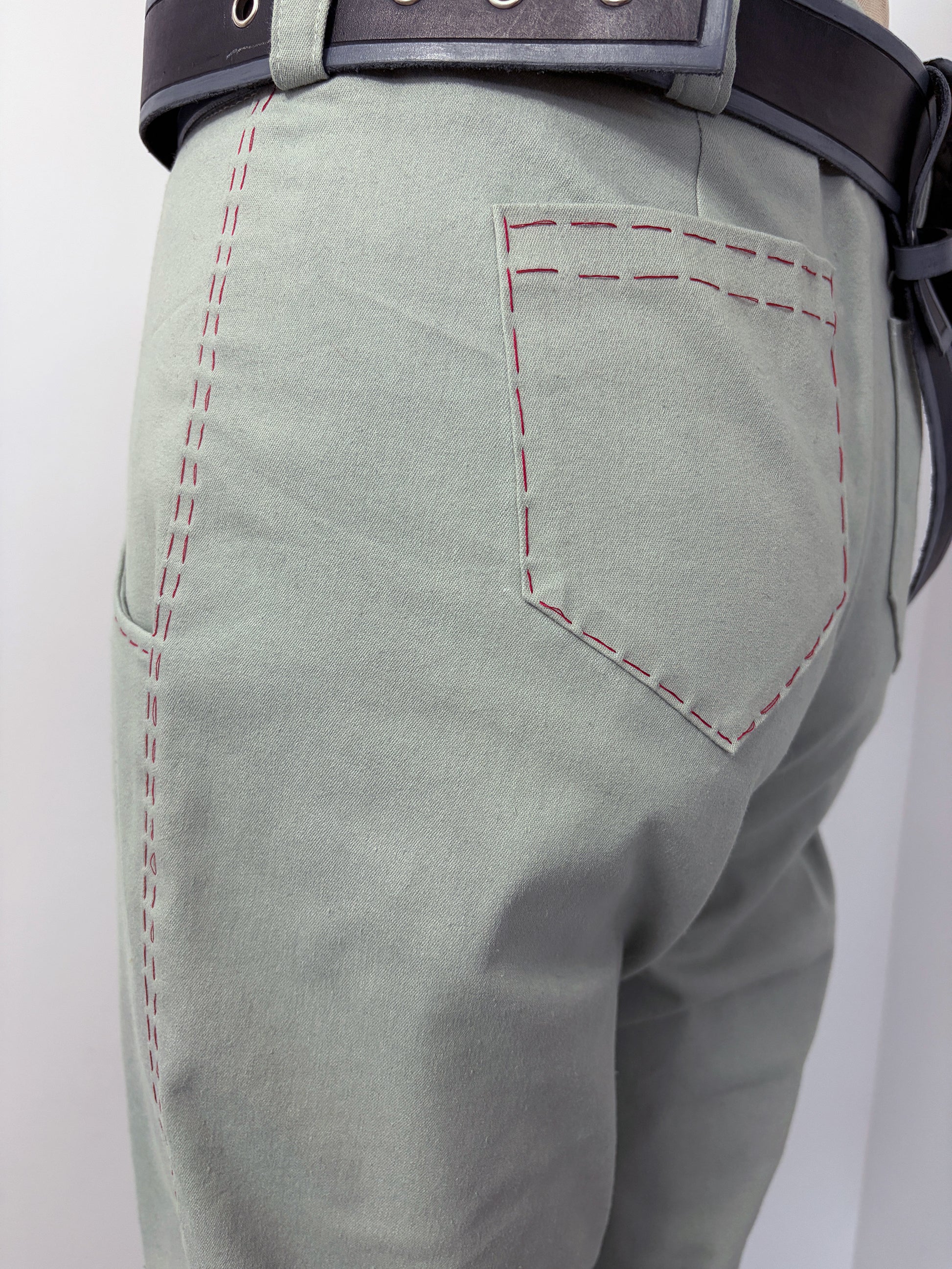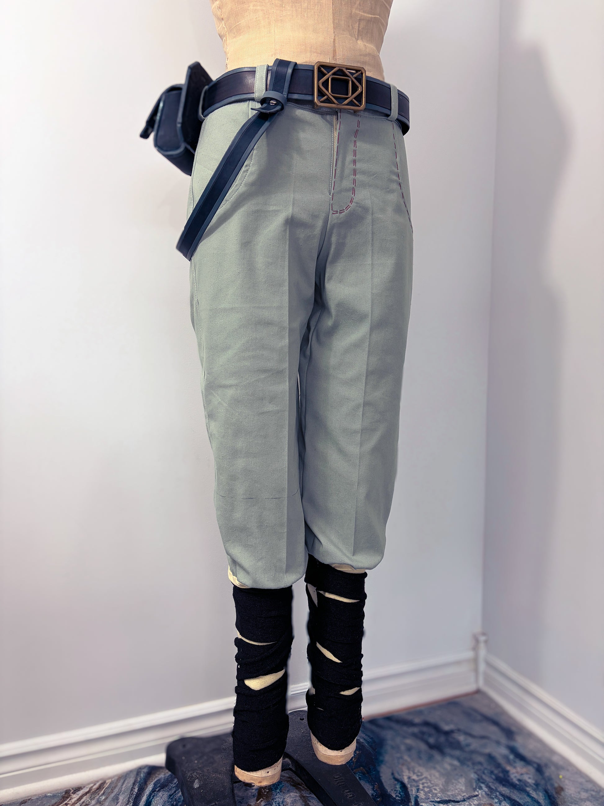 The stretch cuff is ideal for cosplay wear, keeping pant legs streamlined inside tall boots while allowing easy foot entry. Since Sciel wears wrapped bands at the ankle, this Sciel cosplay pattern reduces bulk and makes wrapping more comfortable.